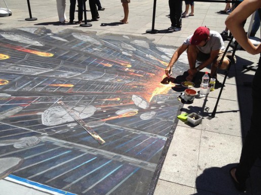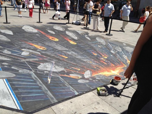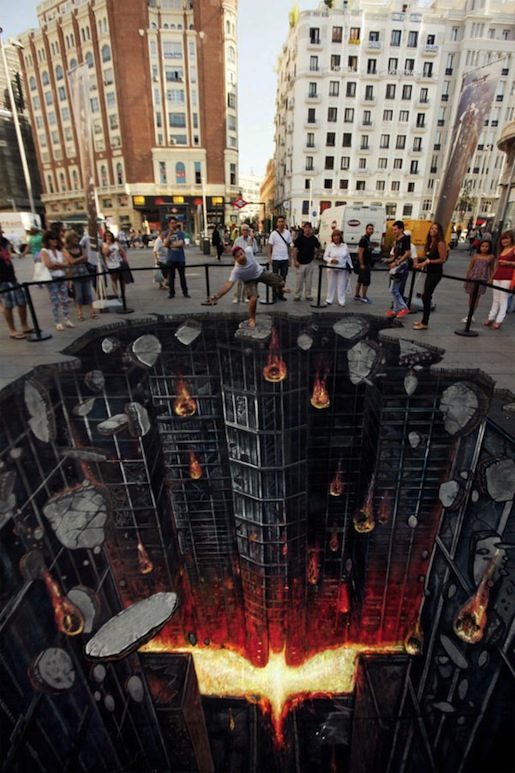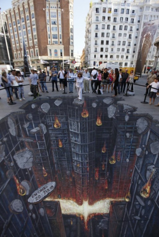 El pasado 16 de julio todo el que pasó por la plaza de Callao en Madrid se topó con este original grafitti callejero en 3D que se realizó para promocionar la nueva película de Batman, «El Caballero Oscuro«. Una gran obra de arte sobre el suelo la cual, vista desde la perspectiva adecuada, da bastante vértigo. Una forma original de salir a la calle a promocionar un estreno cinematográfico y hacer que la gente interactúe con él.